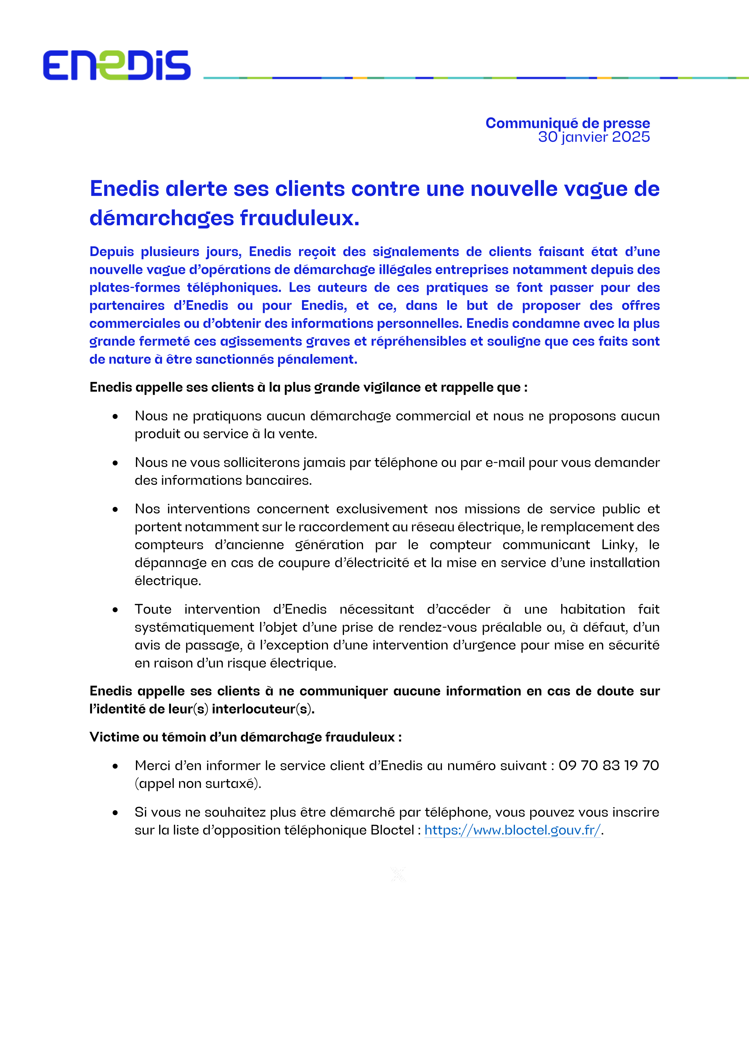 ⚠️ Enedis informe ses clients d'une nouvelle vague de démarchages frauduleux signalée ces derniers jours. Des individus se font passer pour Enedis ou ses partenaires afin de proposer de...