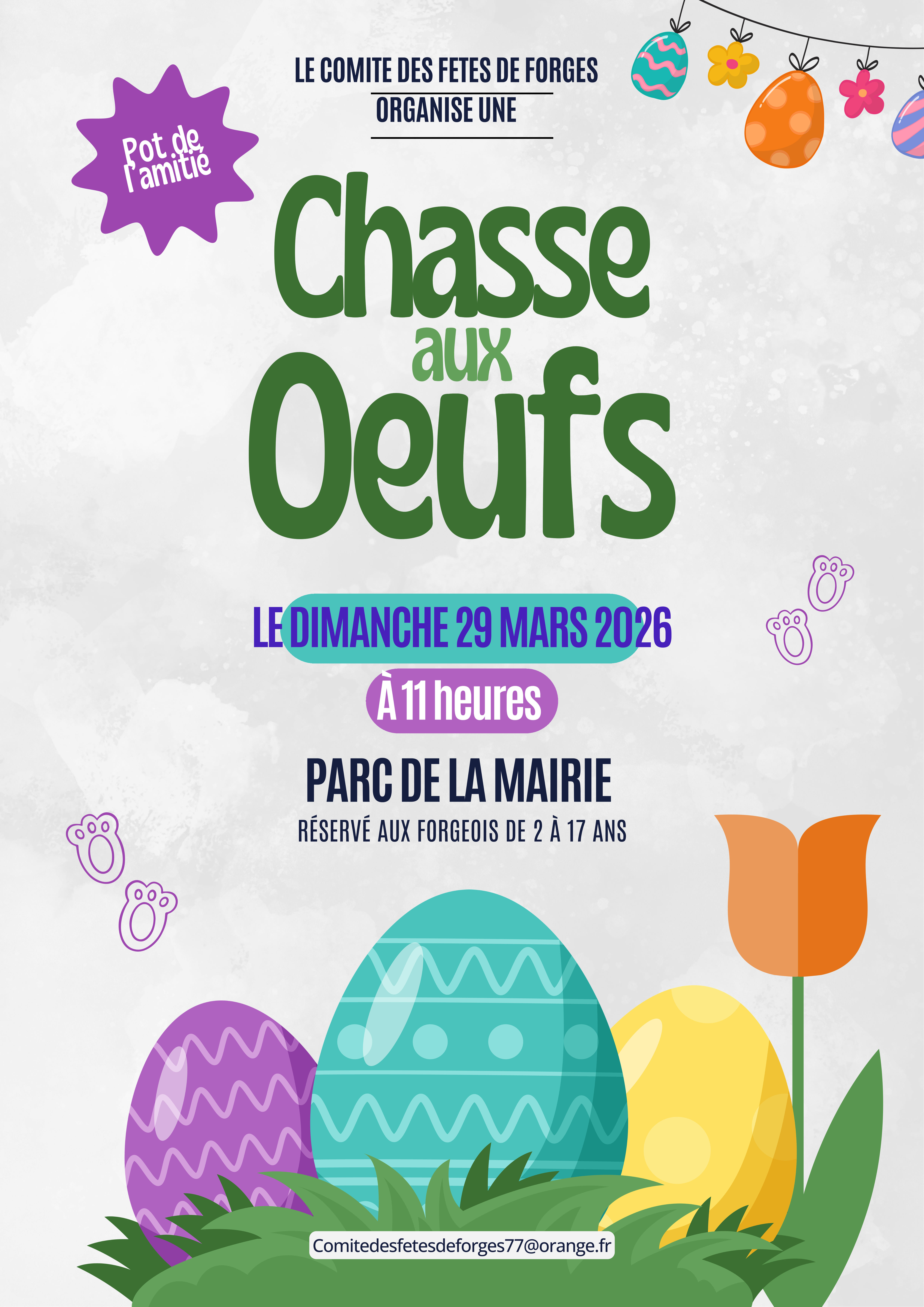 🥚🌷 Le Comité des Fêtes de Forges organise une grande chasse aux œufs le dimanche 29 mars 2026 à 11h au parc de la mairie ! Cet événement festif est réservé aux enfants forgeoises et...