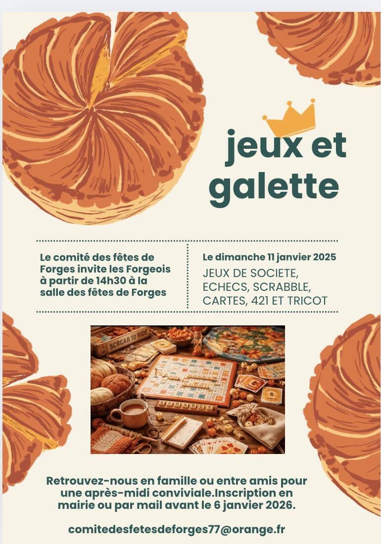 Le Comité des Fêtes de Forges invite le dimanche 11 janvier 2026 à partir de 14h30 à la salle des fêtes, les forgeois à un après-midi jeux et galettes (jeux de société, cartes, scrabble, 421 et tricots)